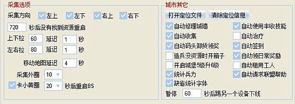 採集方位設定、依每台電腦環境彈性的參數設定,城市經營也提供了,自動修理城牆、自動收集、自動碼頭領貨、豐收技能、自動治療、自動簽到、自動租用工人及自動聯盟幫助