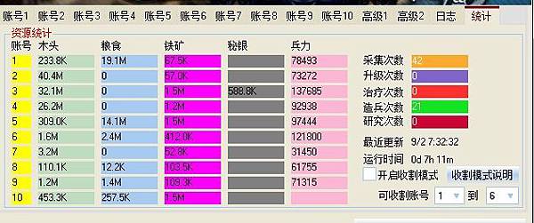 實測下來一個11級的小號,3支部隊,24小時採集能有3M左右資源,我們高級版可掛機6個資源號,一天下來能有18M資源,努力採集輔助程式可以協助您540M資源。