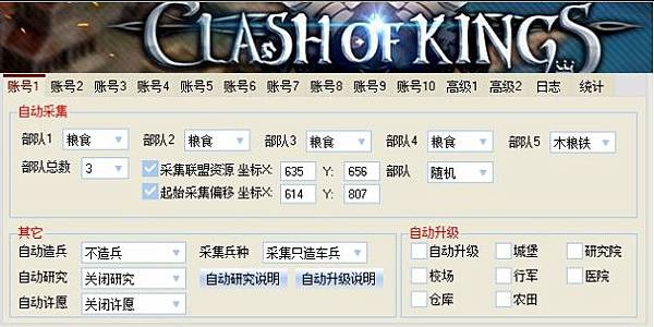 完整的參數設定提供了,自動採集可採選擇採集類型、盟田、指定座標、自動造兵、自動小號升級。